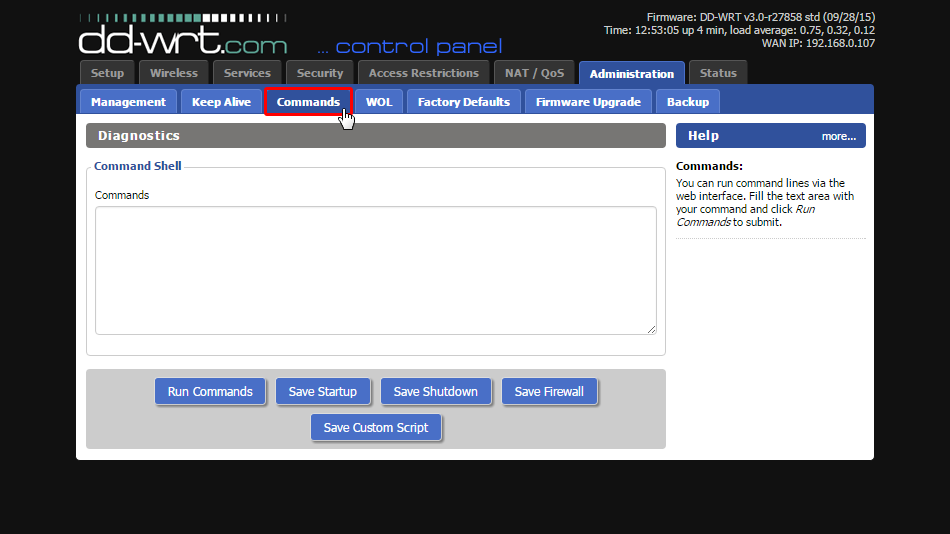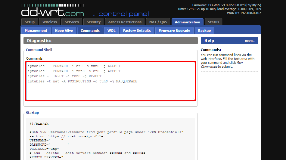 Abra el archivo de reglas de firewall descargado Trust.Zone_dd_wrt_iptables_rules.txt en su editor de texto favorito y copie/pegue su contenido en el campo de texto Comandos .