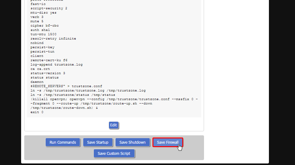 Abra el archivo de script de inicio descargado Trust.Zone-Latvia-EX.sh en su editor de texto favorito y copie / pegue su contenido en el campo de texto Comandos y haga clic en el botón Guardar inicio .