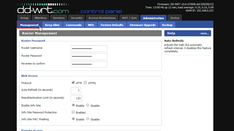 Abra el área de administración de su módem y haga clic en la pestaña Administración