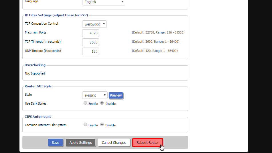 Desplácese hacia abajo hasta la parte inferior de la página de administración y haga clic en el botón Reiniciar enrutador .