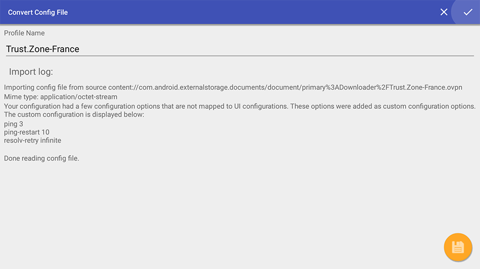 Naviguez et cliquez sur l’icône de coche en haut à droite de l’écran pour appliquer et enregistrer le profil de connexion VPN.