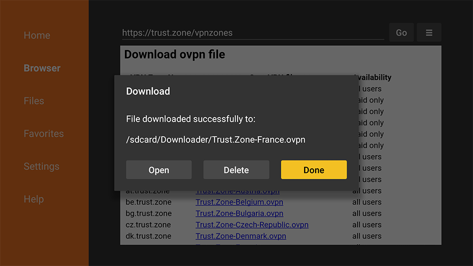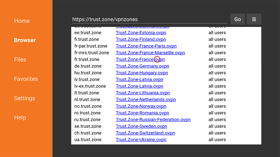 Dans le navigateur de l’application Downloader, sélectionnez l’emplacement VPN souhaité et cliquez dessus pour télécharger le fichier de configuration OpenVPN (fichier .ovpn).