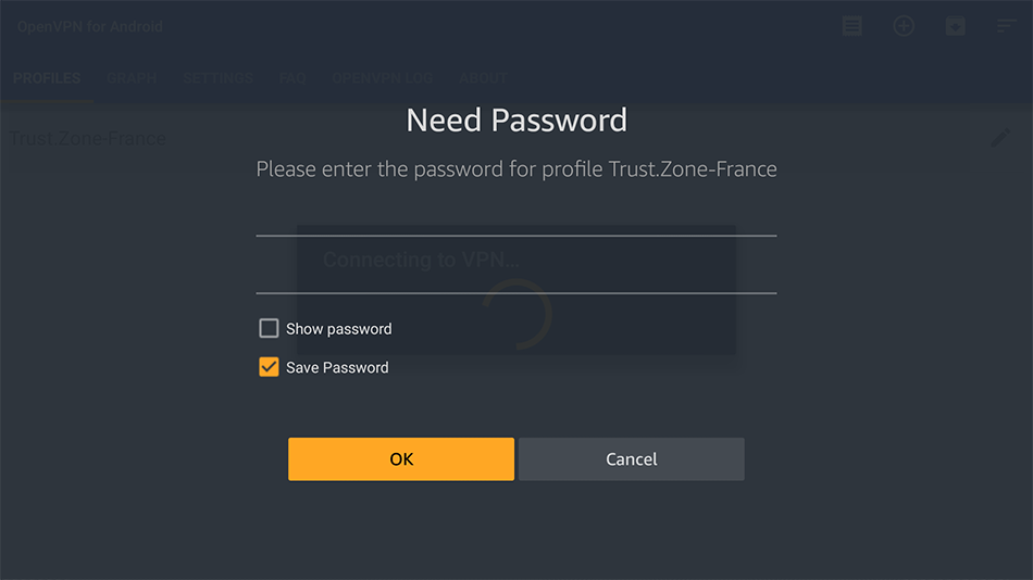 Saisissez votre nom d’utilisateur VPN et votre mot de passe VPN, activez l’option Enregistrer le mot de passe et appuyez sur OK pour vous connecter.