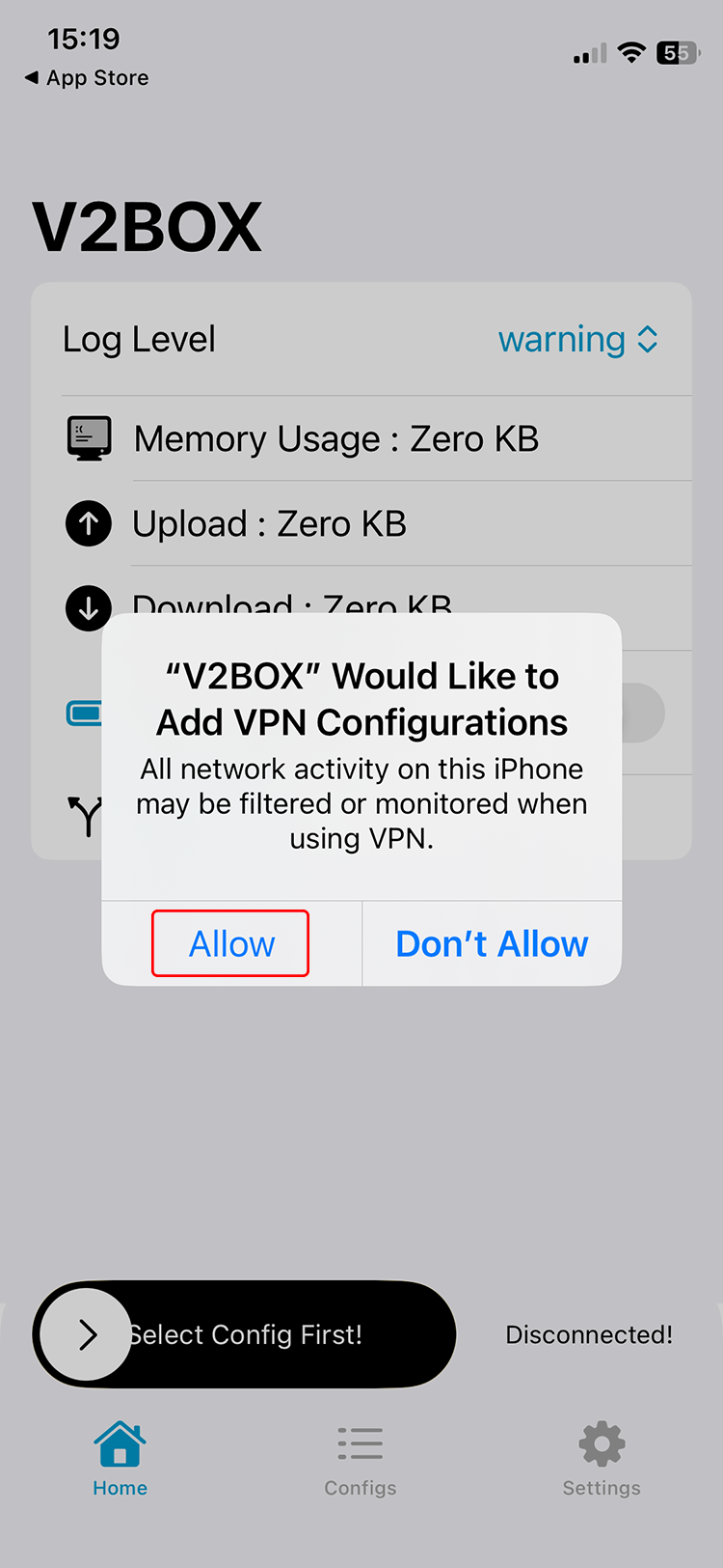 Exécutez l’application V2Box et autorisez V2Box à ajouter des configurations VPN.