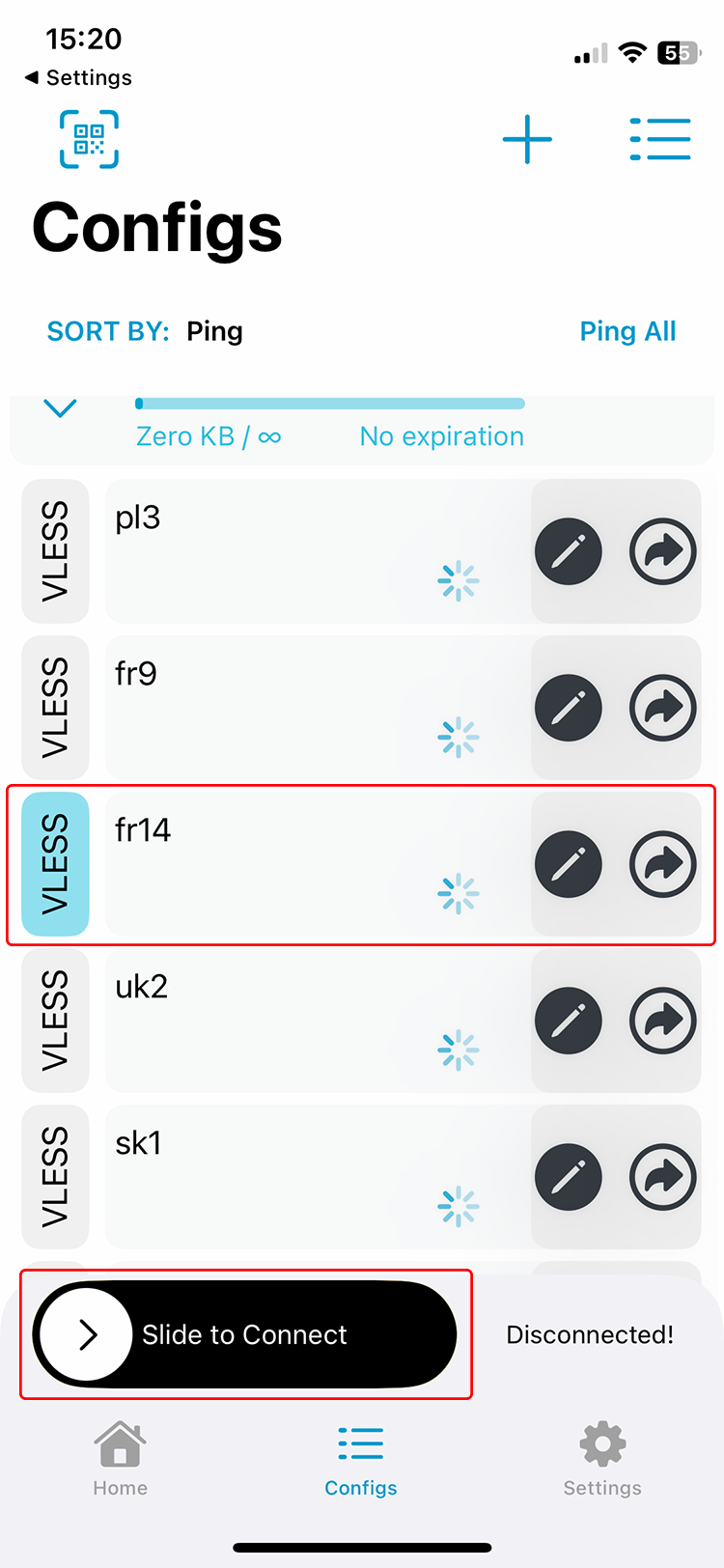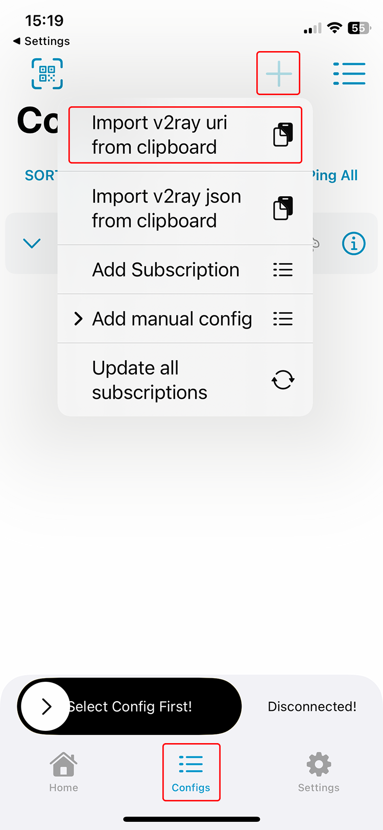 Allez dans l’onglet Configurations , appuyez sur l’icône + , puis appuyez sur Importer l’uri v2ray à partir du presse-papiers.