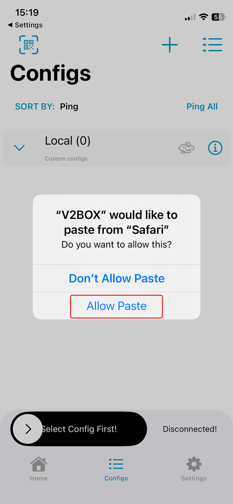 iOS pourrait demander l'autorisation de coller du contenu. Veuillez appuyer sur "Autoriser le collage". Cela ajoutera les serveurs à l'application Hiddify.