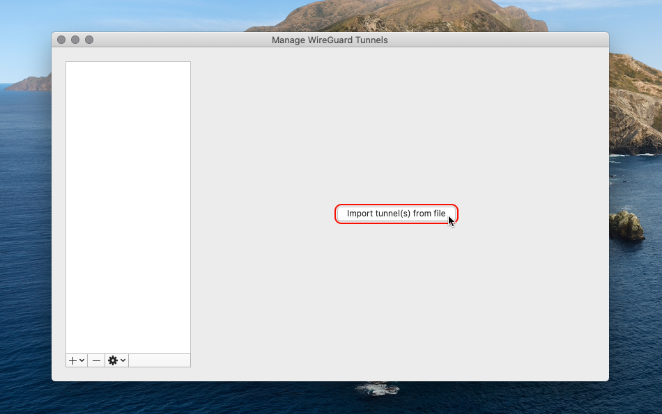 Переключитесь на клиентское приложение WireGuard и нажмите кнопку Импортировать туннели из файла (или нажмите Command-O на клавиатуре, если вы не видите такую кнопку), чтобы открыть диалог импорта.