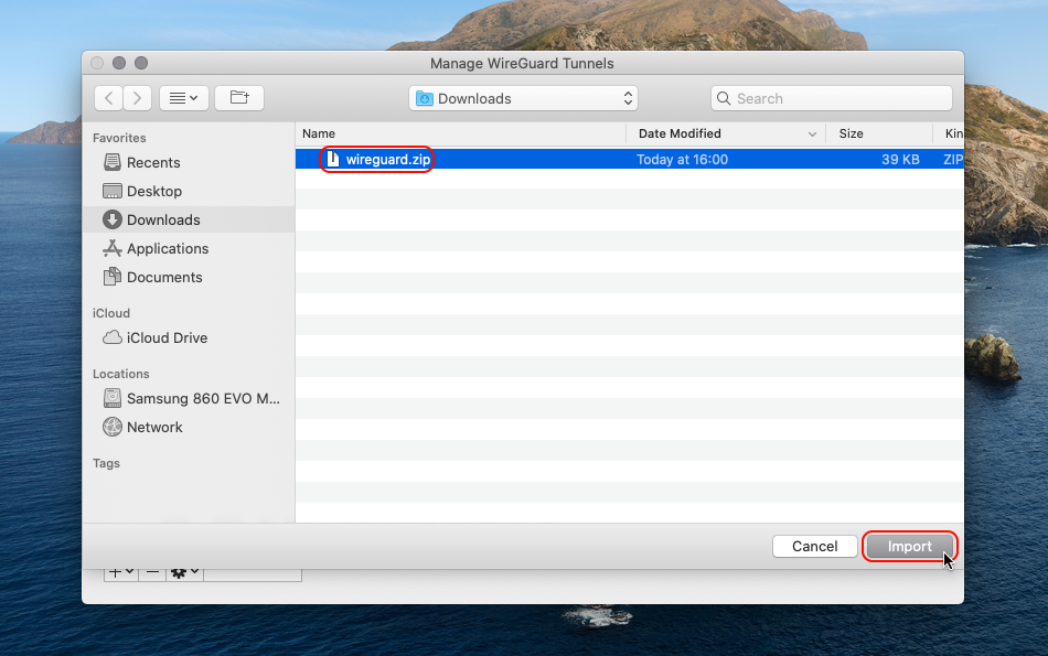 Перейдите к загруженному файлу wireguard.zip и нажмите кнопку Импорт , чтобы импортировать конфигурации VPN.