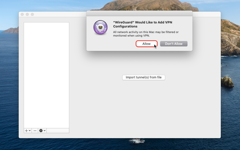 Пожалуйста, нажмите кнопку «Разрешить » в диалоговом окне «WireGuard» хочет добавить конфигурацию VPN .