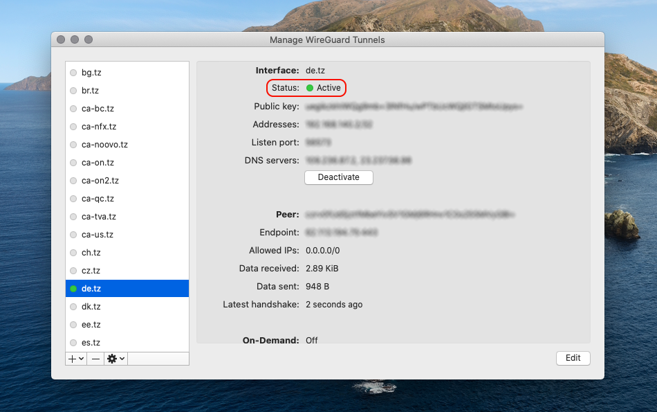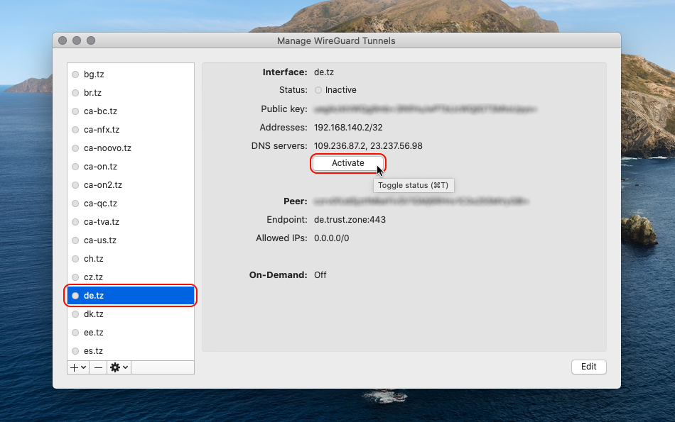 Вы можете выбрать туннель в приложении WireGuard и нажать кнопку Редактировать, чтобы изменить эти настройки.