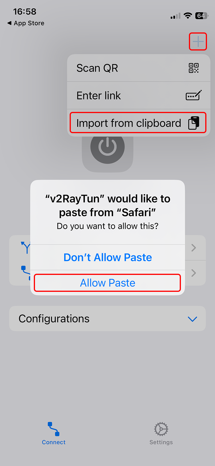 iOS might ask permission to paste content. Please tap on "Allow Paste". This will add servers to the v2RayTun app.