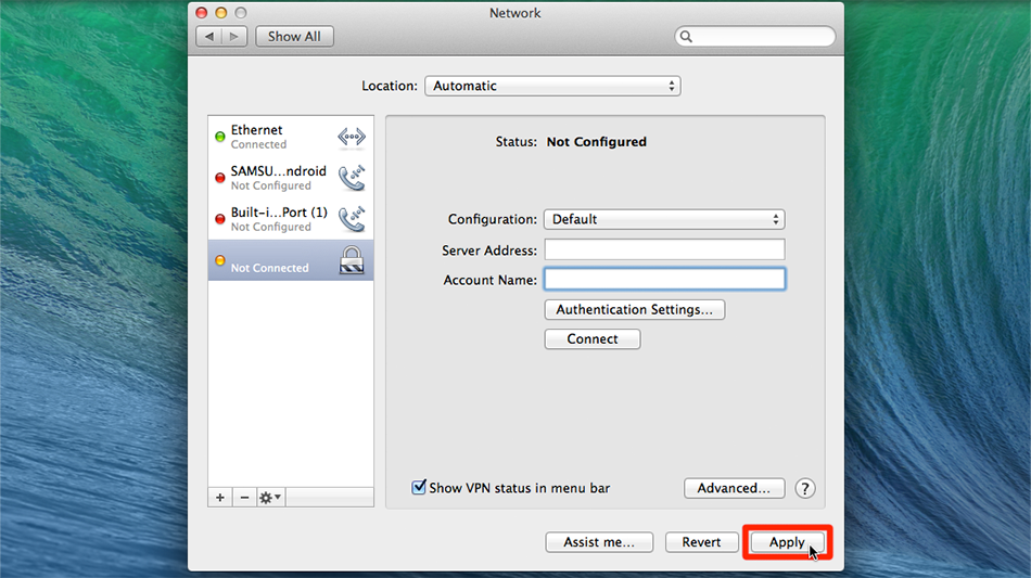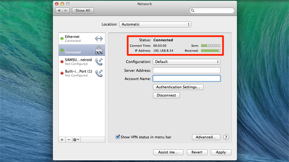 Bağlantı başarıyla kurulmuşsa, durum menü çubuğunda gösterilir. VPN bağlantınızı ağ ayarlarından yönetebilirsiniz.