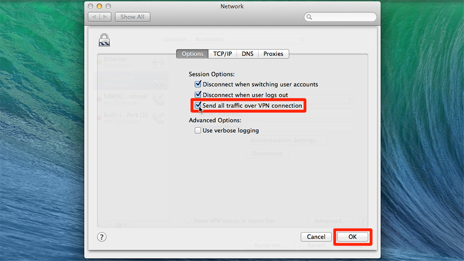 "Tüm trafiği VPN bağlantısı üzerinden gönder" seçeneğini işaretleyin. Ardından "Tamam" ı tıklayın.